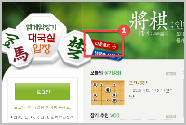 Mgame 장기 설치가 완료되면, 대국실에 입장할 수 있습니다. 화면 왼쪽 상단에 있는 '대국실 입장' 아이콘을 클릭하면 대국실로 들어갈 수 있습니다.