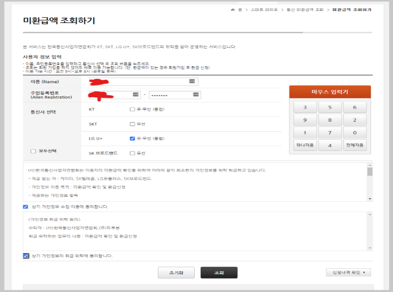 위와같인 이름, 주민번호를 입력을 하고 '조회'를 누르면 진행이 됩니다.