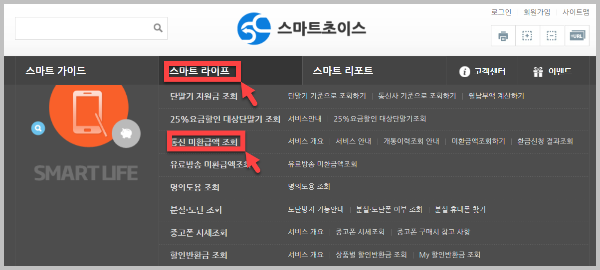 이 홈페이지는 요금제를 찾아주는 사이트이기도 하지만, 그 외에도 약정, 통신 미환급액 등의 서비스를 이용할 수 있도록 되어 있습니다. 그중에서 가장 대표적인 서비스는 스마트초이스 미환급액 조회하기 서비스입니다.