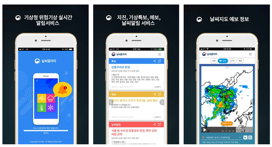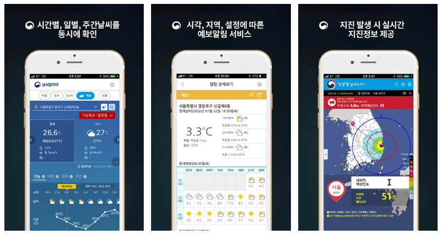 아주 오래전에는 기상청 앱이 있었습니다. 그러다가 api만 제공을 하고 기상청 자체 앱이 한동안 오랬동안 없었습니다. 그러다가 최근에 다시 기상청에서는 날씨알리미라는 모바일 앱을 만들었습니다.
