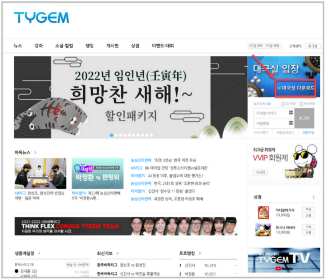 타이젬 홈페이지의 우측 상단에는 '대국실 다운로드'라는 문구가 있습니다. 해당 문구를 클릭하면 타이젬바둑에서 제공하는 게임 클라이언트를 다운로드할 수 있습니다. 설치 과정은 어렵지 않으며, "다음"을 선택하면 쉽게 설치할 수 있습니다.