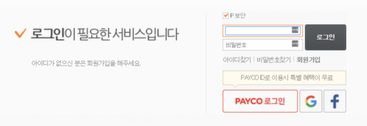 '로그인'을 클릭하면 위의 이미지처럼 화면이 변화하며, 아이디가 없는 사용자는 여기서 '회원가입'을 선택하여 새로운 아이디를 만들 수 있습니다. 아이디를 생성하는 방법에는 크게 네 가지가 있습니다.