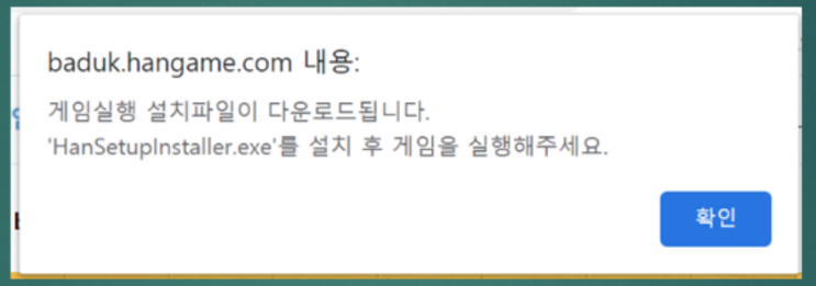 만약 구글 크롬 브라우저에서 설치를 진행하신다면, 위 이미지와 같은 팝업창이 하나 나타날 것입니다. 인터넷 익스플로러에서 설치를 진행하시는 경우, 이와 유사한 창이 화면의 하단에 등장합니다. '확인' 버튼을 클릭하시면 HanSetupInstaller.exe라는 설치 파일을 다운로드하실 수 있습니다. 이 파일을 통해 한게임 바둑 설치를 진행하실 수 있습니다.