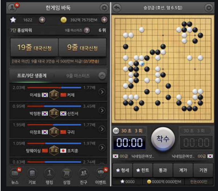 하지만 한게임은 화투와 트럼프로 대표되는 카드놀이 뿐만아니라 다양한 것들을 제공하고 있습니다. 이 중에서도 한게임 바둑은 여러가지 서비스 중 대표작이라고 할 수 있습니다.
