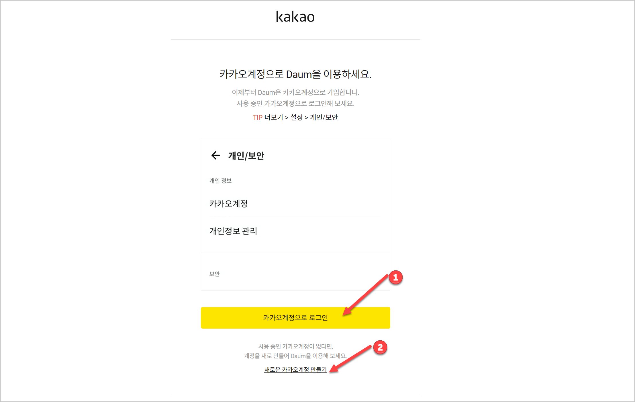 기존에 카카오계정이 있는 사람은 카카오 계정으로 다음을 가입하면 됩니다. (카톡 ID와 동일합니다.) 해당 ID가 없는 경우에는 새로운 아이디를 생송하면 됩니다.