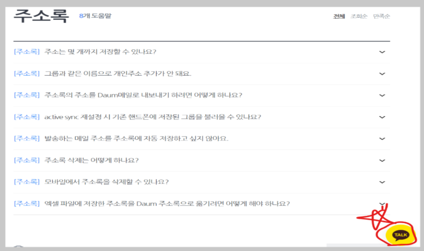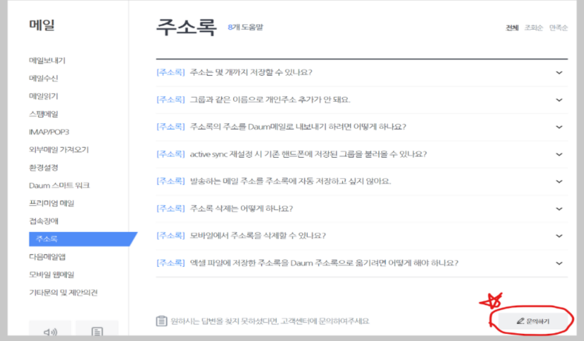 '주소록' 소메뉴를 클릭하면 위와 같은 화면이 나타납니다. 필요한 답변을 찾지 못한 경우 '문의하기' 버튼을 통해 직접 문의를 해볼 수 있습니다.