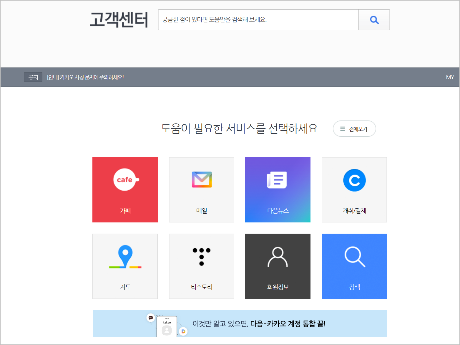 다음 서비스를 이용하면서 어려움이 발생했다면, 대부분의 문제들은 다음 고객센터 홈페이지를 통해 해결할 수 있습니다.