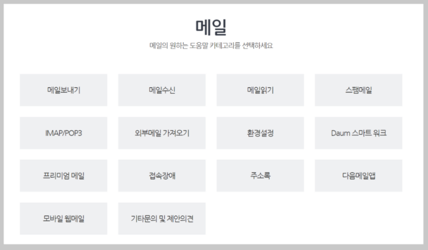 '메일' 카테고리는 가장 많이 문의되는 항목이며, 이곳에서는 여러 소메뉴를 볼 수 있습니다. 해당 문제에 대한 항목을 선택하시면 됩니다.