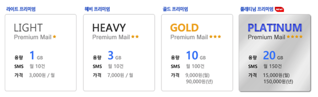 가격이 이정도 됩니다. 사실 메일서비스야 뭐 특별한게 있겠습니까.. 무료 서비스가 있으면 가입을 해볼까 싶은데 무료버전에 대한 안내는 보이지 않네요.