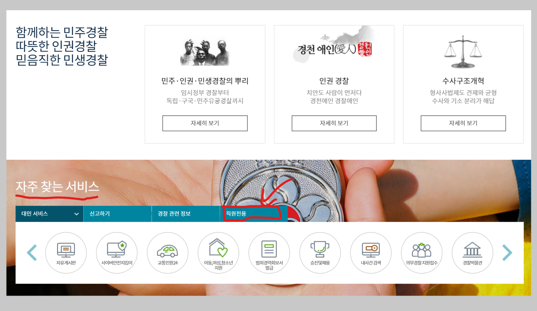 경찰청 홈페이지에 들어가면 하단에 위와 같은 화면을 볼 수 있습니다. 자주 찾는 서비스를 확인하면 여러가지 서비스가 있죠. 거기에서 '직원 전용'을 클릭을 해 줍니다.