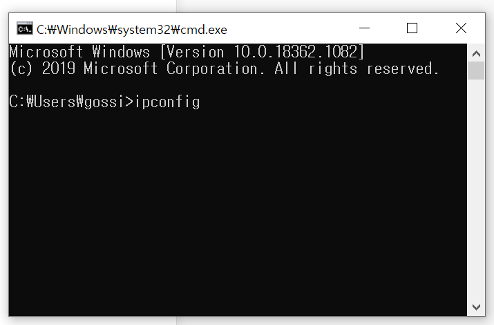 그러면 위의 화면처럼 명령프롬프트창이 열리게 됩니다. 여기에서 ipconfig를 입력을 합니다.