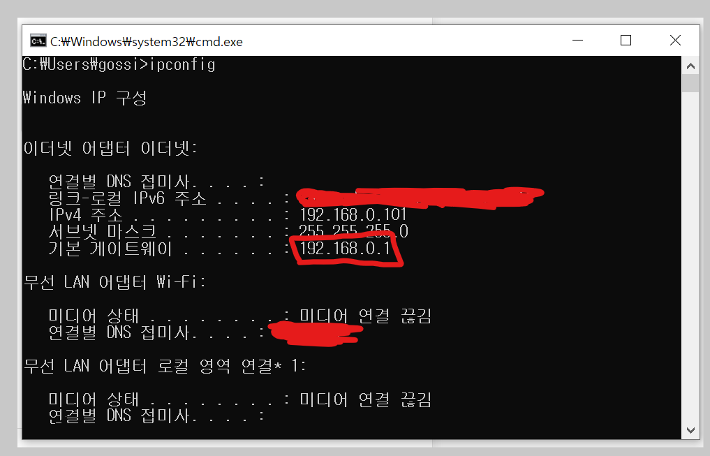 그러면 위의 화면처럼 나오는데 여기에서 기본게이트웨이를 찾아줍니다. 기본게이트 웨이 옆에 숫자가 있을것이에요 이것을 입력을 하면 들어갈 수 있습니다. 저같은 경우에는 192.168.0.1 로 되어 있네요.