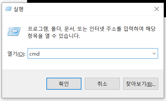 윈도우키 + R 을 눌러서 실행창을 열어둡니다. 그리고 cmd 를 입력을해서 윈도우 텍스트 모드로 들어가줍니다.