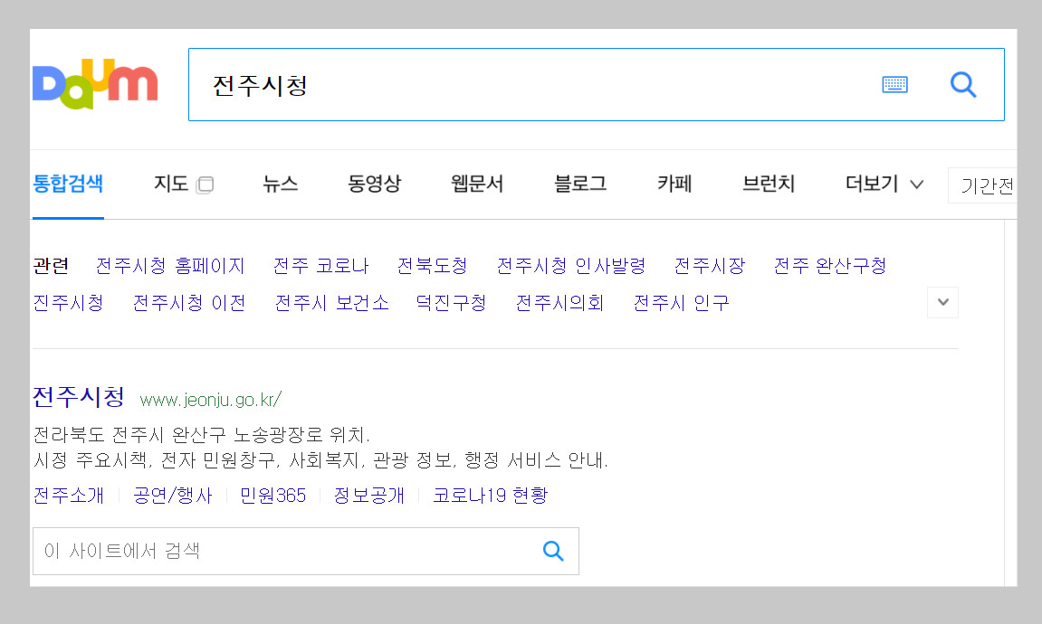 위 화면은 다음에서 '전주시청'이라고 검색을 했을때의 결과입니다. 홈페이지라는 말을 넣지 않더라도 가장 맨 위에 검새결과가 나오고 있습니다.