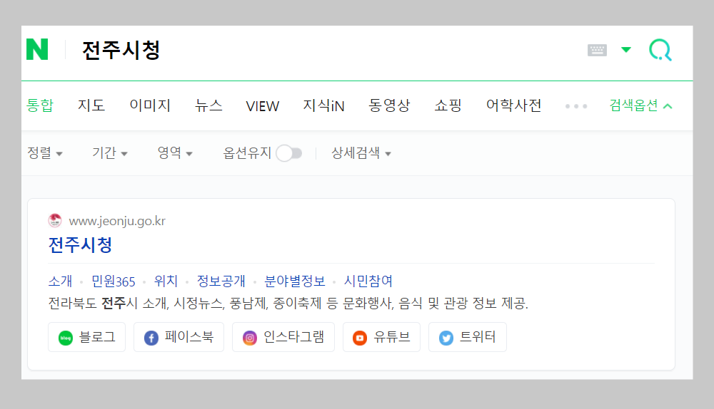 위 화면은 네이버에서 전주시청이라고 검색했을때의 결과입니다. 다음의 검색결과보다 좀더 다양한 검색결과가 나오고 있습니다. 블로그, 페이스북 등 여러 SNS 도 같이 보여주고 있습니다.