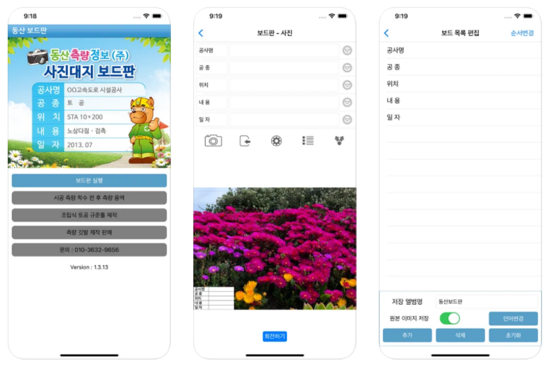 동산 보드판은 다양한 현장에서 사진과 함께 날짜정보, 현장명, 작업명과 같은 문자정보를 사진촬영과 동시에 사진 위에 기록을 할 수 있는 어플입니다. 일반적인 건설현장, 물건을 관리하는 작업, 실험 상황, 검수기록 등을 위하여 사용을하시면 될것같습니다.