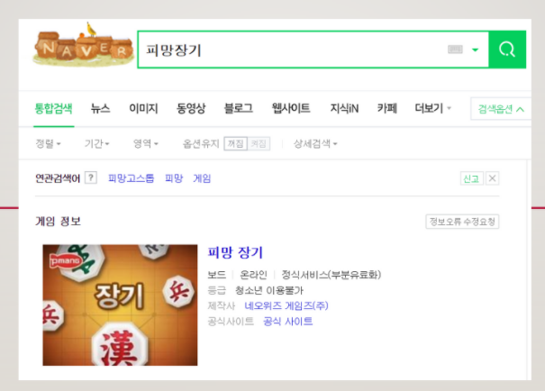 위 화면은 피망장기를 네이버에서 검색했을때의 결과입니다. 여기에있는 것을 클릭을 하시면 네오위즈 게임즈의 피망장기로 들어가실 수 있는것이지요. 다음에서도 마찬가지의 결과를 보이고, 구글에서도 동일한 결과를 낳습니다.