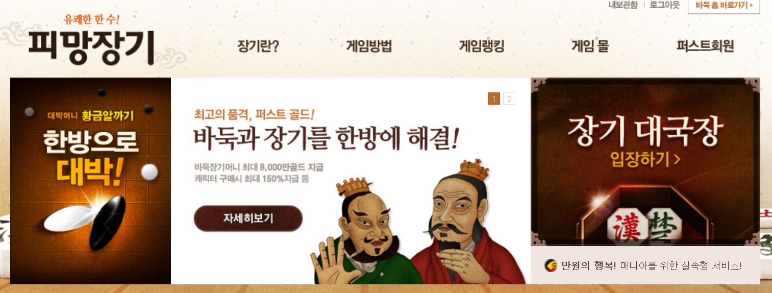 피망장기 홈페이지에 들어가면 위와 같은 화면이 나옵니다. 예전에는 크롬에서는 절대 접속을 할 수 없었는데, 이제는 피망장기도 크롬에서 게임을 할 수 있도록 변하였습니다. 플래시를 사용을 못하니 그런것 같기도 하네요. 뭔가 발전이 있는것 같아서 좋습니다. 하지만 이 홈페이지 화면은 몇년동안 유지가 되는지 모르겠습니다.