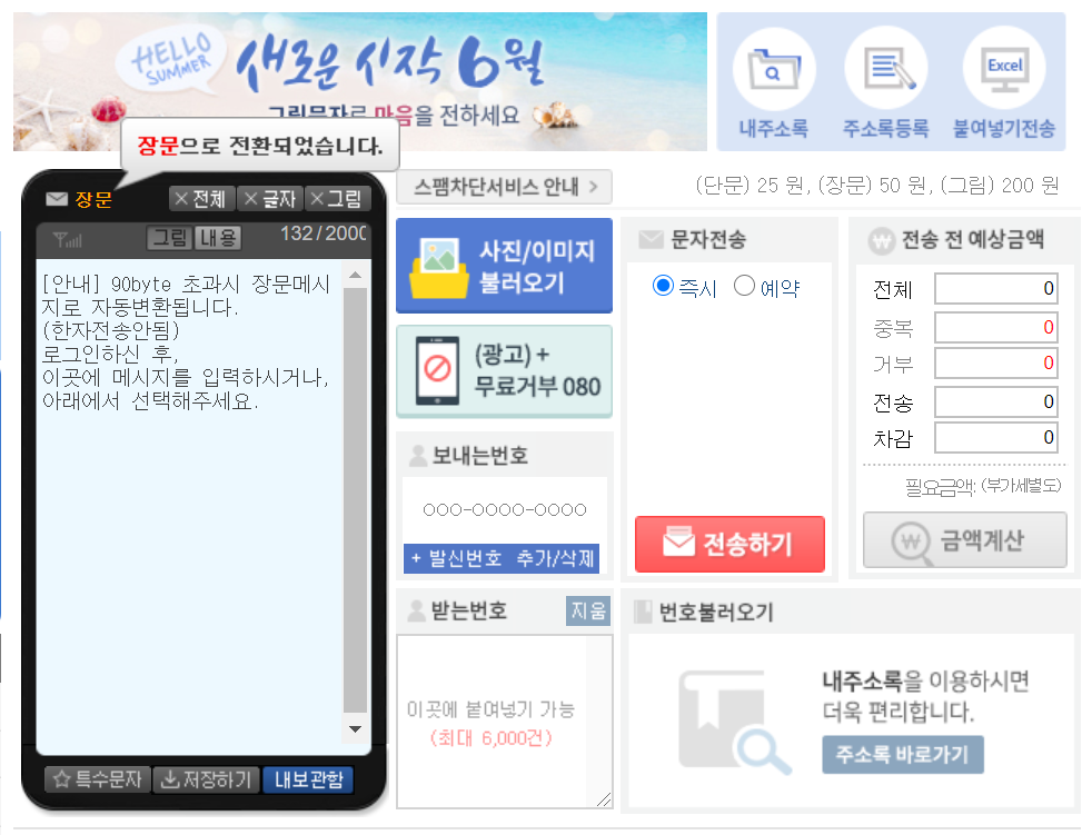 문자나라의 문자비용은 25원입니다. 1건당 25원정도라고 생각하시면 되고, 장문은 50원입니다. 그림은 더 비싸지요.