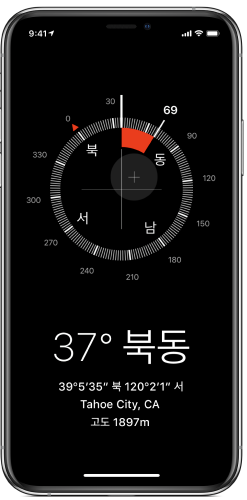 앱 중에서 '나침반'을 검색을 하셔서 이용을 하시면 됩니다. 기본적으로 사용자의 방향 좌표, 그리고 고도가 화면 하단에 포함이 됩니다. 정확한 방향을 확인하기 위해서는 아이폰을 수평으로 들어 십자선을 나침반 중앙에 정렬을 하는것이 좋습니다.