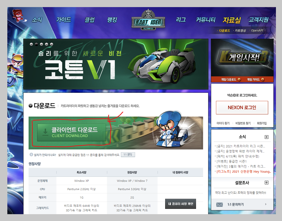 카트라이더 PC 다운로드페이지로 들어가시면 위와 같은 모습이 나옵니다. 여기에서 '클라이언트 다운로드'를 클릭을 하시고 설치를 하시면 카트라이더 PC버전을 즐길 준비가 완료가 된 것입니다.