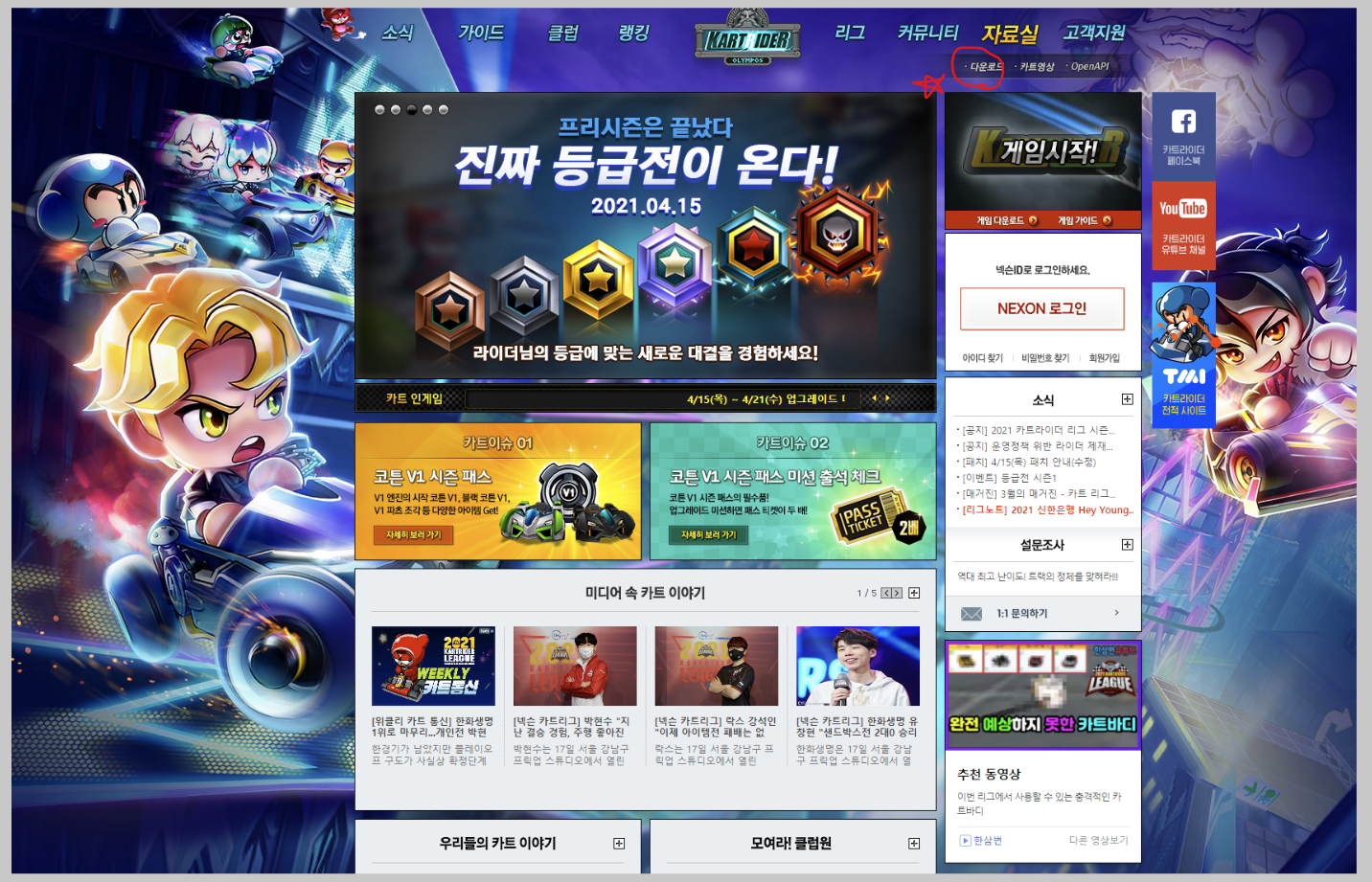 여기에서 우측 상단을 보면 자료실이 있습니다. 이것을 마우스 오버하면 '다운로드'라고 되어 있습니다. 이것을 클릭을 하면 카트라이더 PC 다운로드 페이지로 들어가실 수 있습니다.