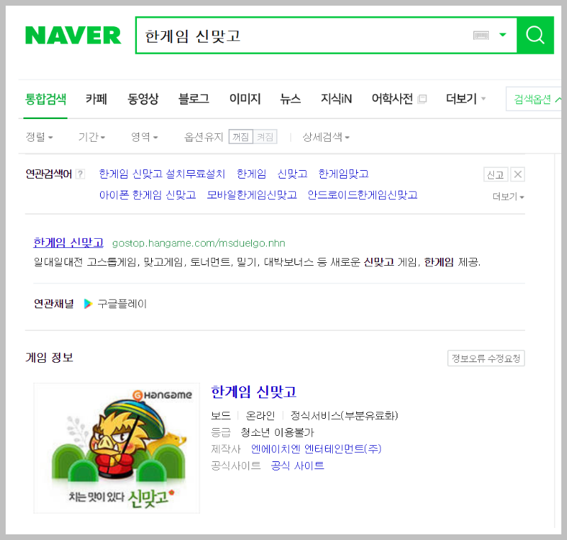 가장 먼저 한게임 신맞고 다운로드 하기 위해서는 네이버에서 한게임 "신맞고"라고 검색을 해야 합니다. 검색 후 가장 위에 있는 것을 클릭을 하면 한게임에 들어가게 됩니다.