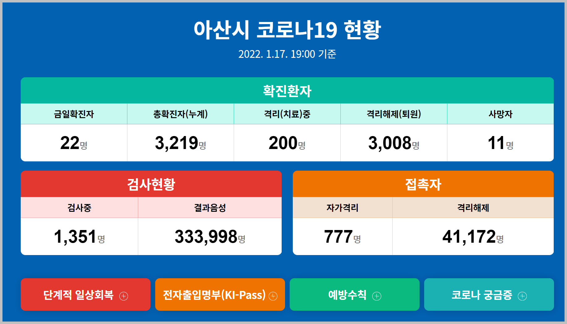 아산시 코로나 19 현황 페이지는 위와 같습니다. 가장 중요한 확진환자에 대해서 손쉽게 확인을 할 수 있도록 보여지고 있습니다. 그리고 자가격리자가 얼마나 되는지, 확진자가 얼마나되는지 볼 수 있습니다.