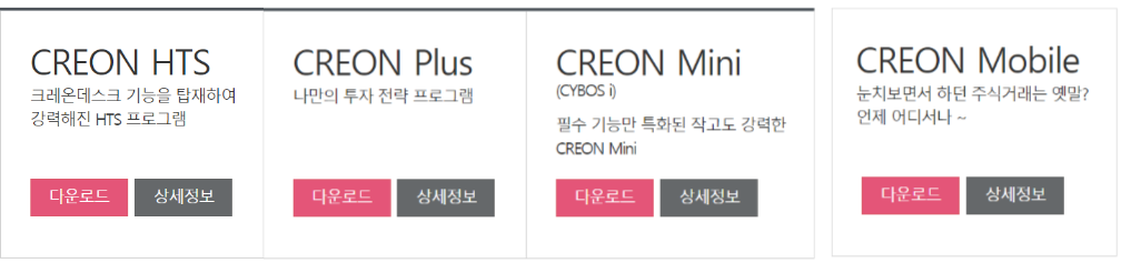 크레온을 클릭하면 위와 같은 화면이 나옵니다. 여기에서 원하는 것을 선택하면 되는데, 뭘 해야 할지 모르겠다면 가장 왼쪽 거인 CREON HTS를 다운로드하시면 됩니다.