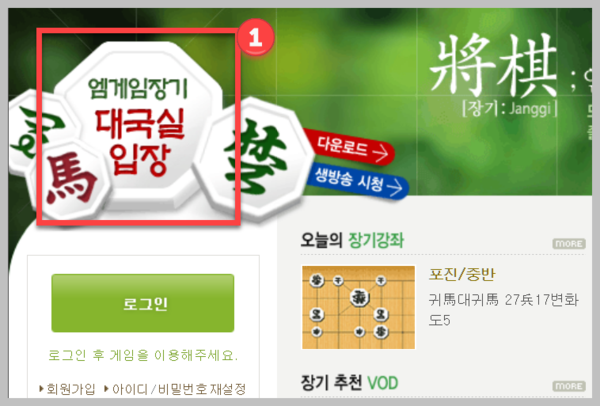 Mgame 장기 설치가 완료되면, 대국실에 입장할 수 있습니다. 화면 왼쪽 상단에 있는 '대국실 입장' 아이콘을 클릭하면 대국실로 들어갈 수 있습니다.