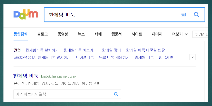 위의 이미지는 다음 검색 엔진에서 "한게임 바둑"을 검색했을 때의 결과 화면을 보여주는 것입니다. 여기에서, 가장 상단에 위치한 '한게임바둑 (baduk.hangame.com)' 링크를 클릭하면 해당 서비스에 바로 접속할 수 있습니다. 이렇게 접속 후, 필요한 다운로드 및 설치 과정을 진행하시면 됩니다.